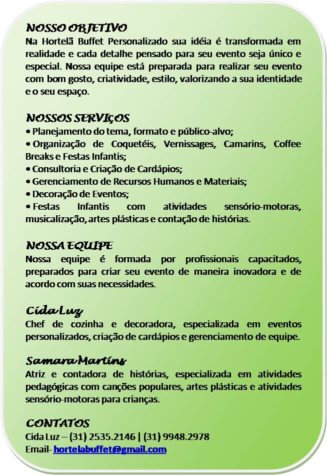Sejam Bem-Vindos ao site da Hortelã Buffet Personalizado, nesse espaço vocês encontrarão todas as novidades sobre nossos eventos e serviços.